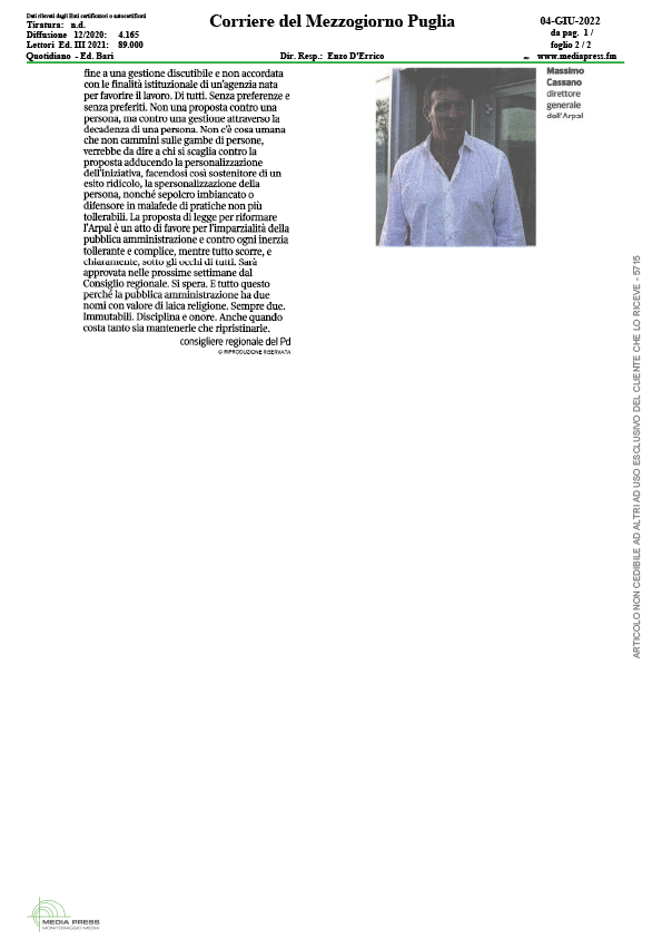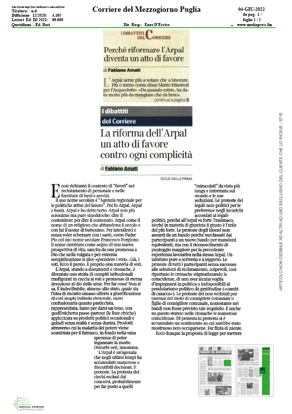 Articolo pubblicato su Corriere del Mezzogiorno Puglia del 4 giugno 2022